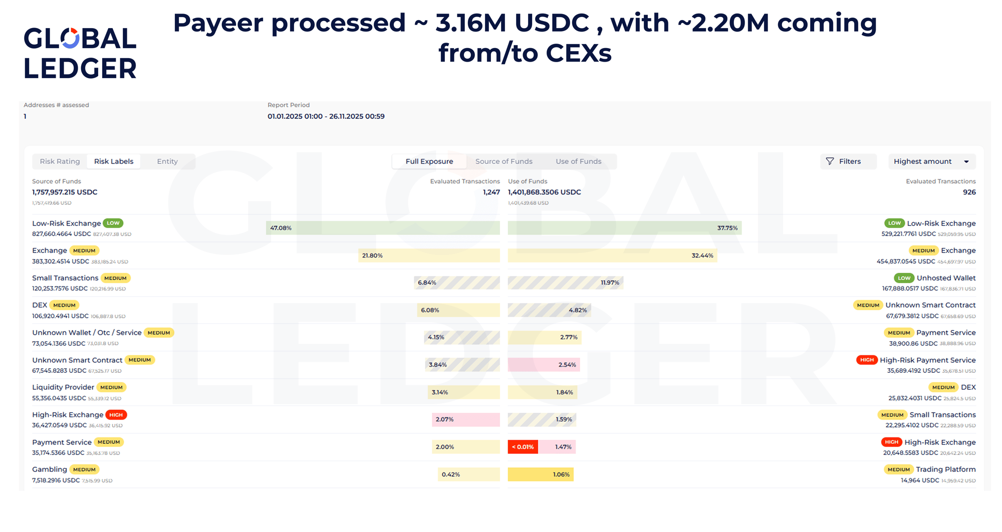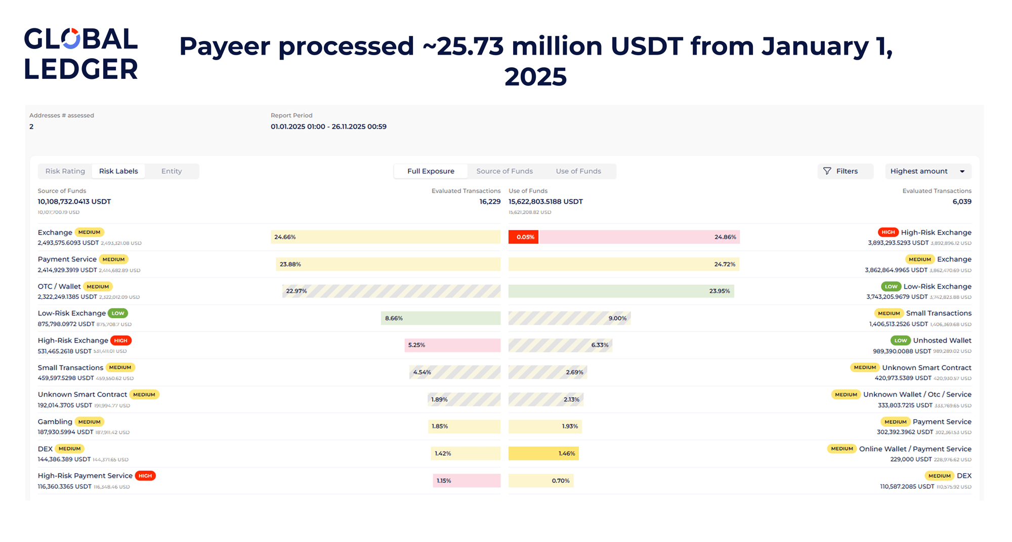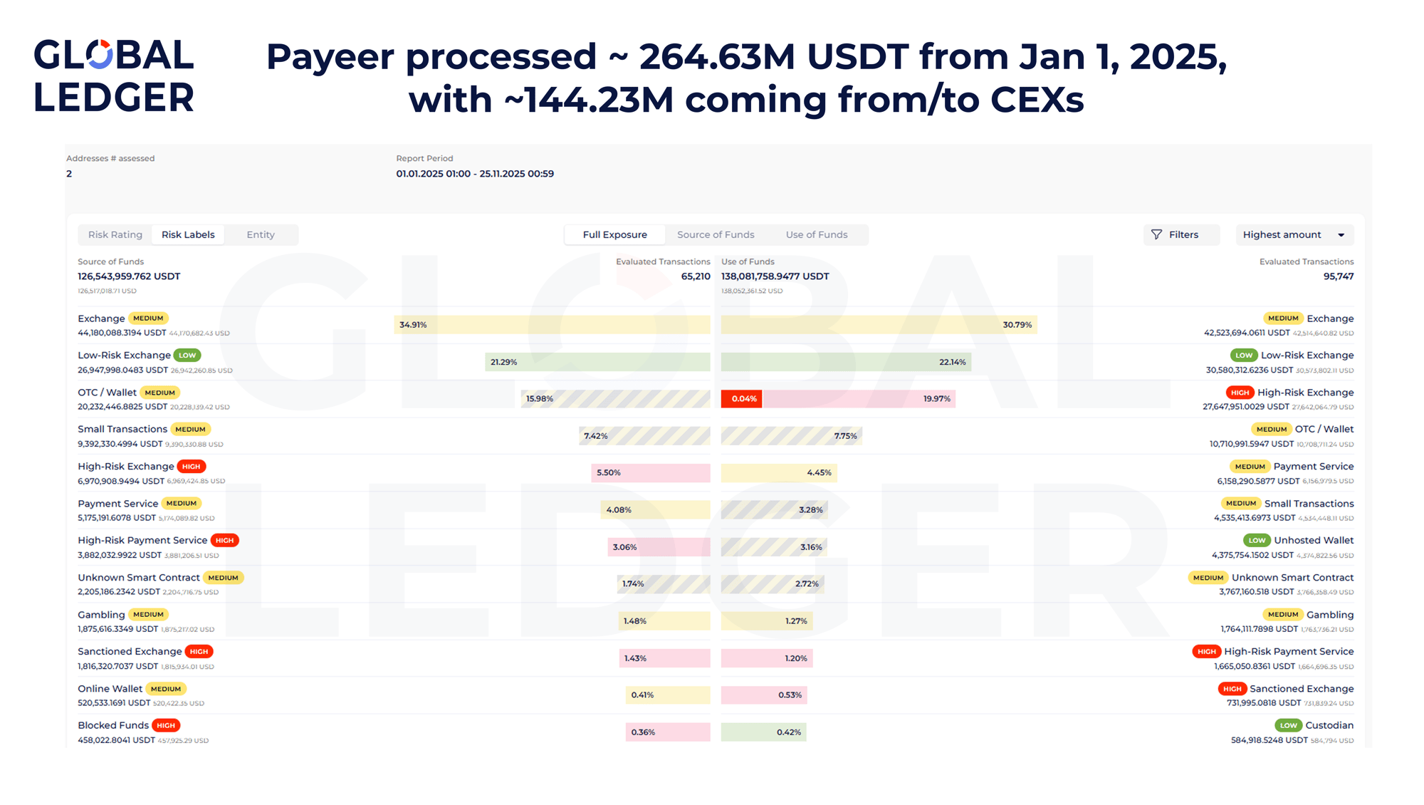 According to Global Ledger’s 2025 exposure assessment, Payeer processed a total of 264.6 million USDT across TRON-based transactions during the period (126.54 million USDT in source of funds and 138.08 million USDT in use of funds).