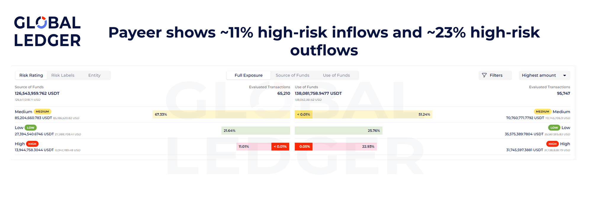 Payeer’s risk distribution shows that high-risk entities accounted for 11.01% of all source of funds and 22.93% of all use of funds.